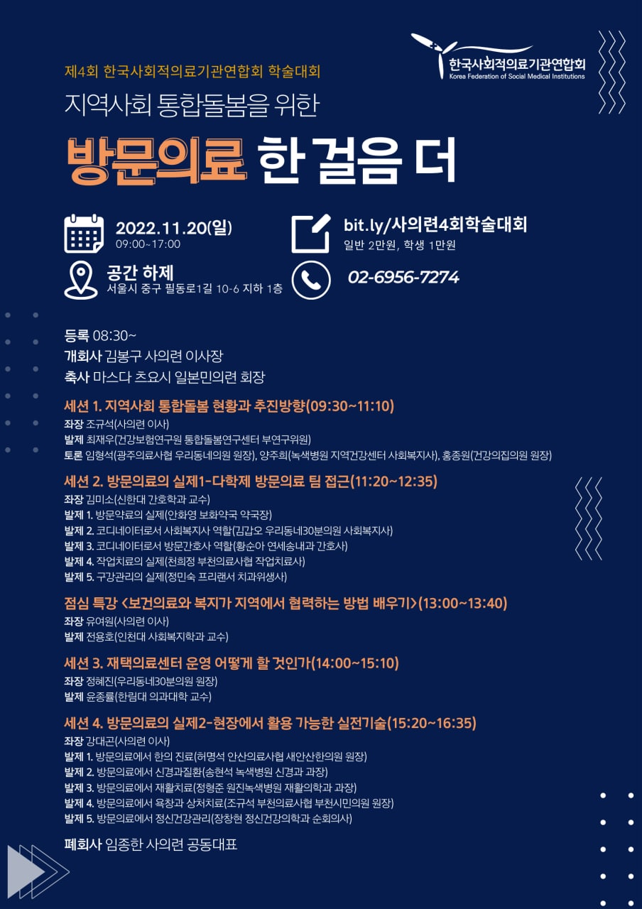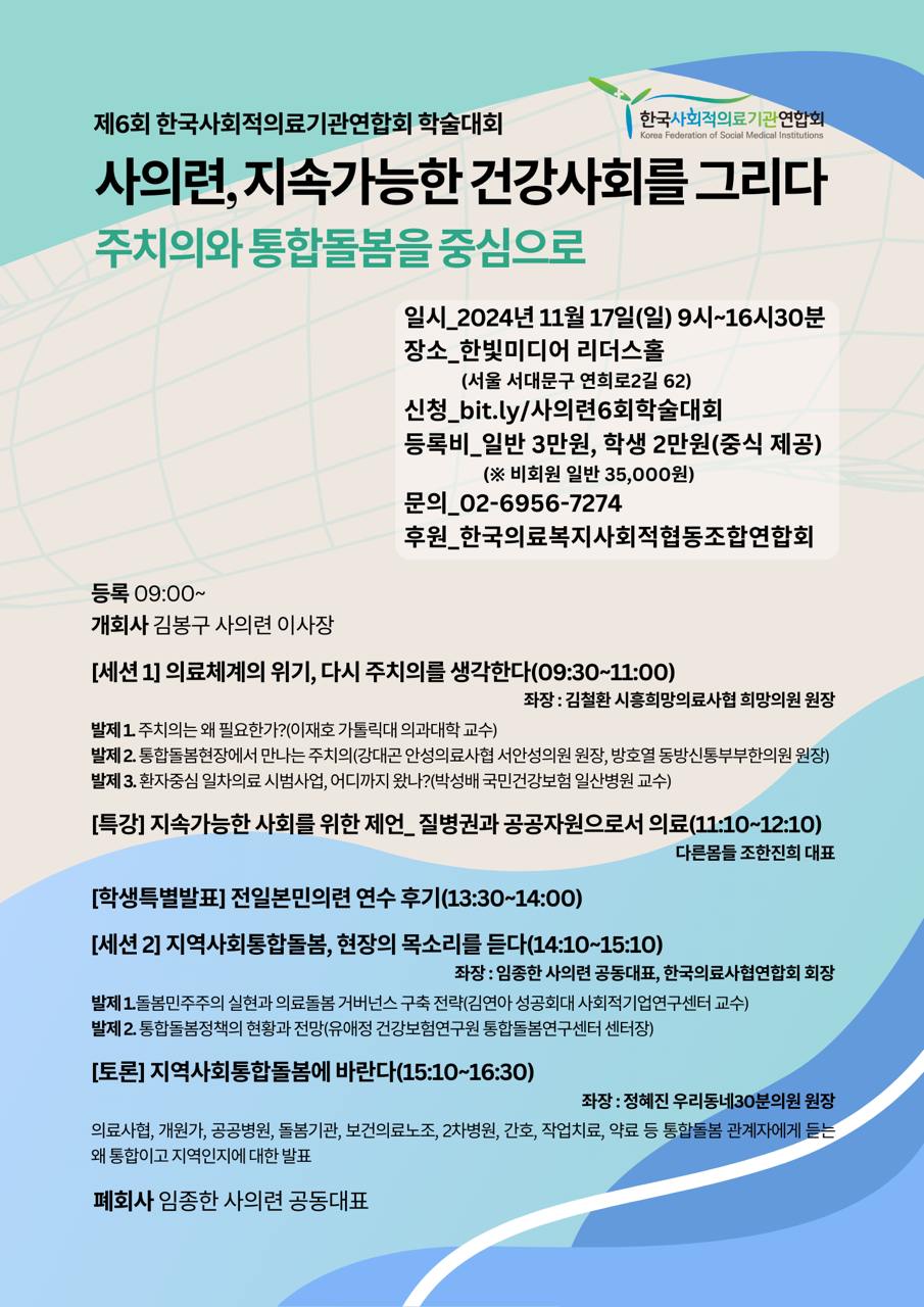 한국사회적의료기관연합회, 돌봄과 미래, 한국의료복지사회적협동조합연합회, 한국재택의료협회가 10월 19일 '돌보는 의료'를 주제로 연합학술대회를 엽니다. 사전등록은,