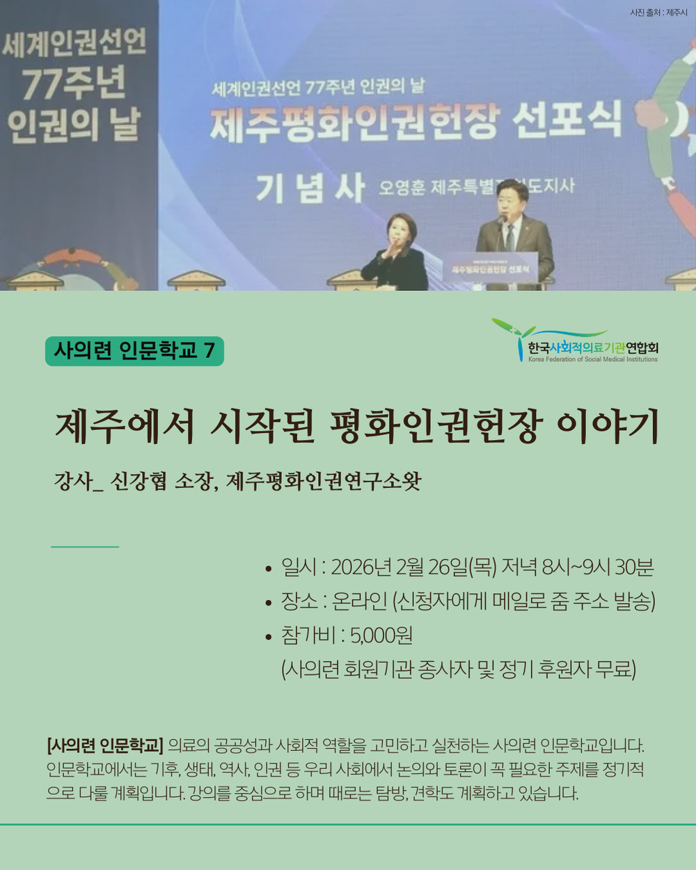 [사의련 인문학교7] 제주에서 시작된 평화인권헌장 이야기 (2/26(목) 저녁 8시, 온라인)