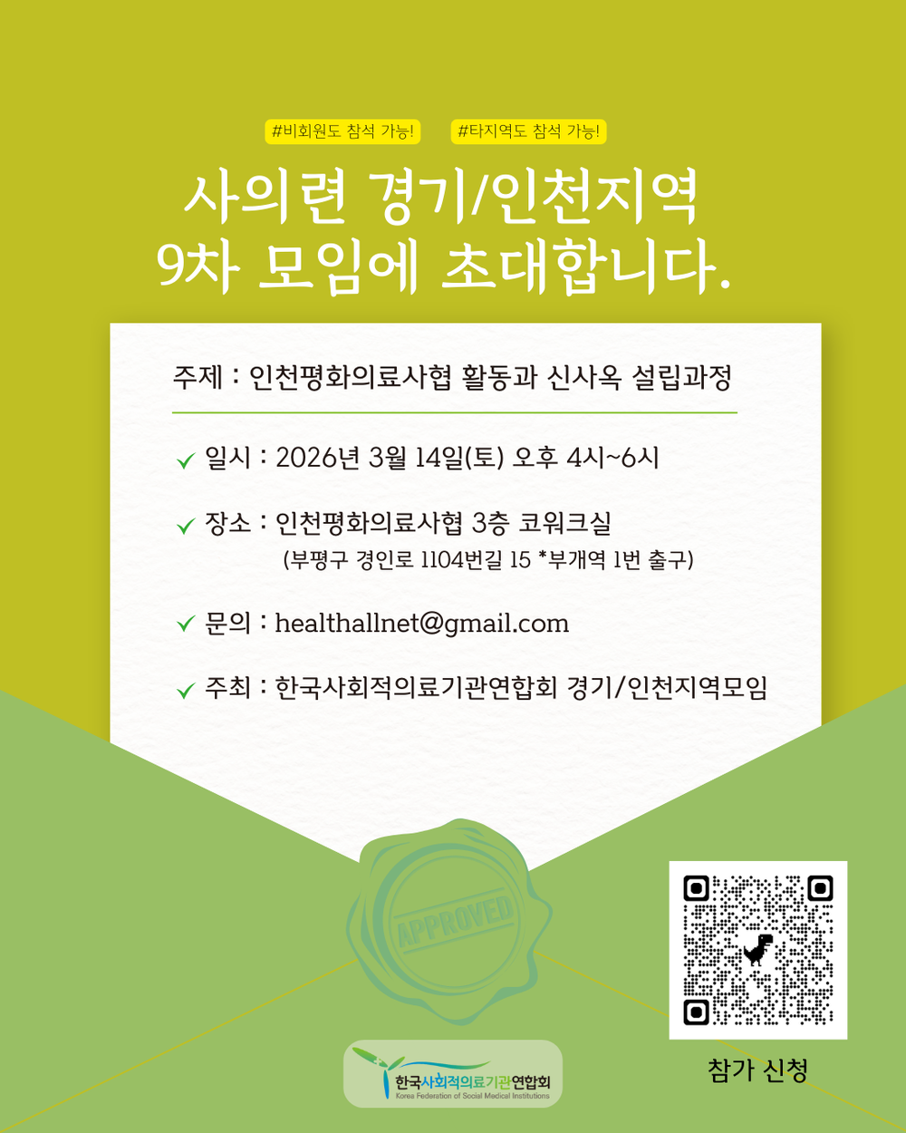 안녕하세요, 한국사회적의료기관연합회(사의련) 사무국입니다. 다가오는 3월, 사의련 경기/인천지역 회원 및 활동가분들과 함께하는 제9차 지역모임이 열립니다. 이번 모임은 '