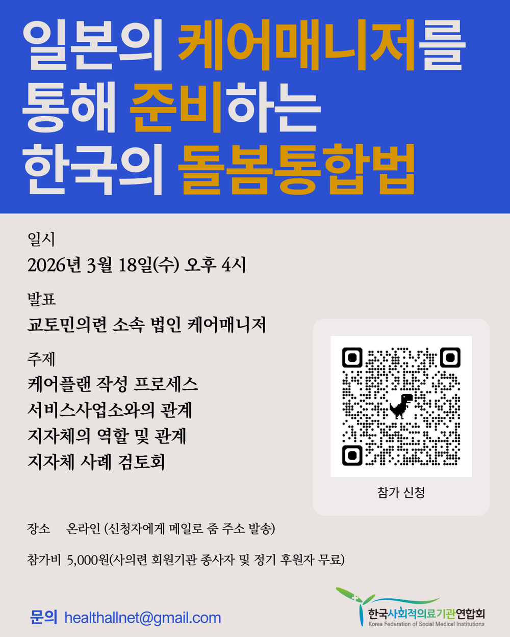 안녕하세요, 한국사회적의료기관연합회(사의련)입니다. 사의련에서는 한국의 돌봄통합법 시대를 준비하며, 앞선 경험을 가진 일본의 사례를 통해 실질적인 전략과 지혜를 배우는 온라인 세미