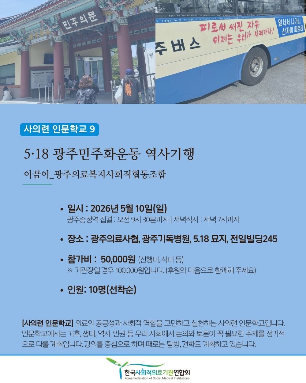 사의련 인문학교가 처음 현장으로 갑니다. 광주의료복지사협 견학도 예정돼 있습니다.